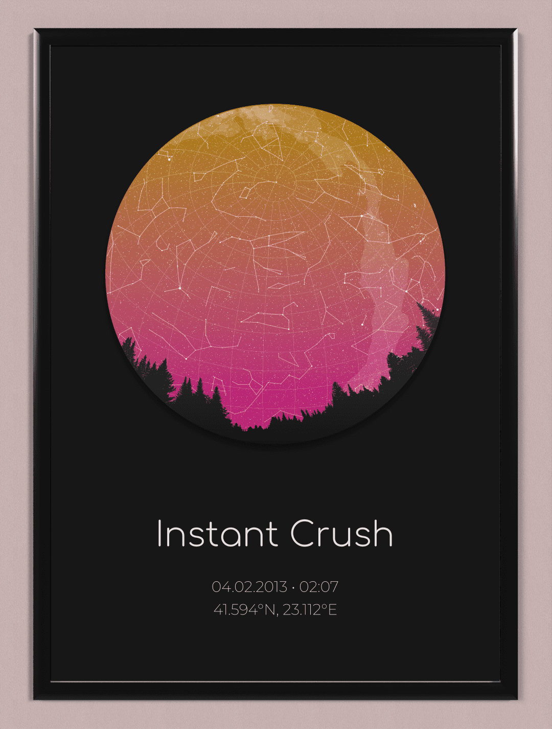 На плаката се изобразява небесният купол с разположението на съзвездията, така както са били подредени в избрания миг. Добавят се датата, часът и мястото на събитието, а в центъра или под картата може да включите и лично послание – кратка фраза, която да пази духа на този момент завинаги.