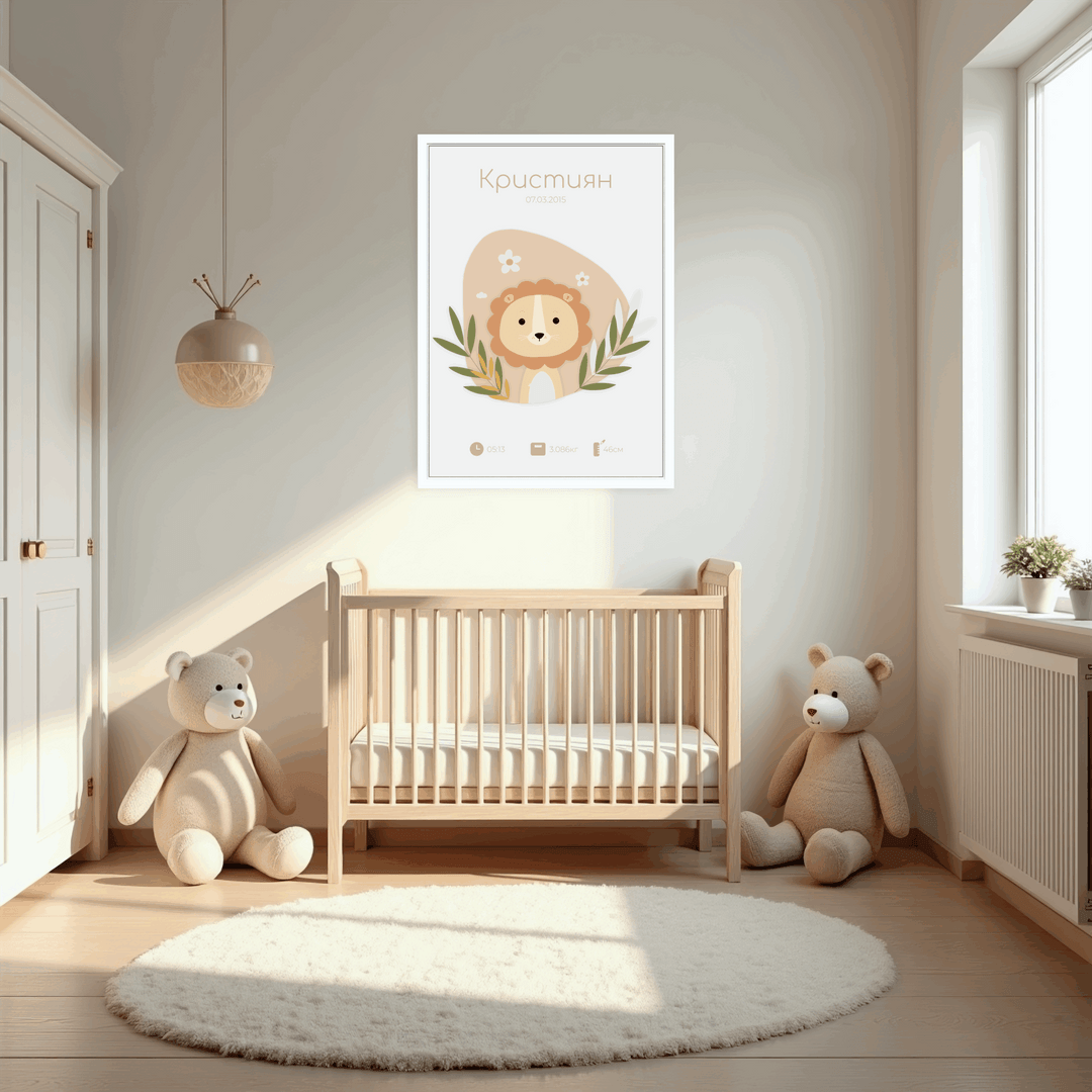 Продуктът представлява стилен дизайн на бебешката визитка, поставен в рамка, във избран от Вас размер. Рамката е дървена със антирефлексно стъкло и въженце за окачване.