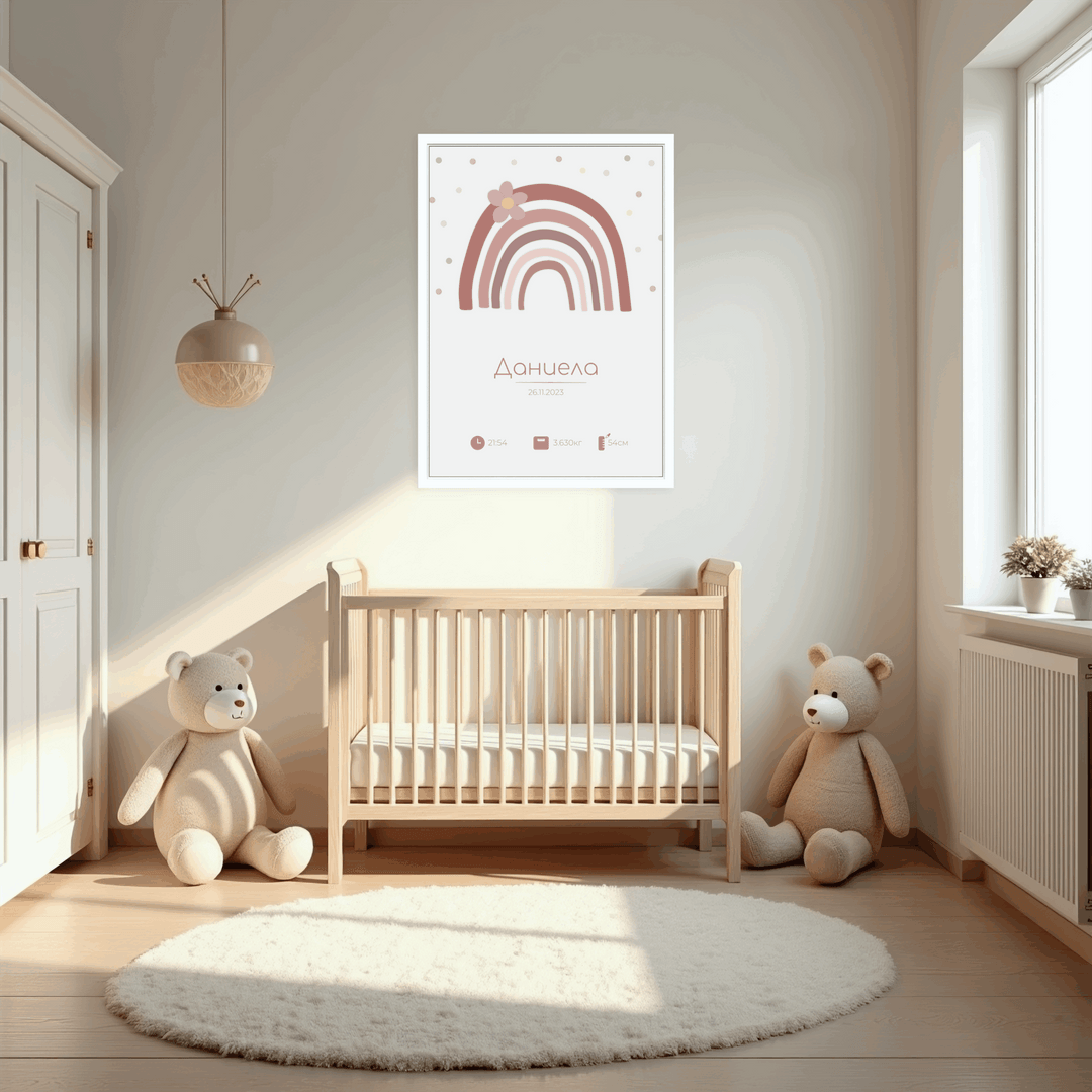 Продуктът представлява стилен дизайн на бебешката визитка, поставен в рамка, във избран от Вас размер. Рамката е дървена със антирефлексно стъкло и въженце за окачване.