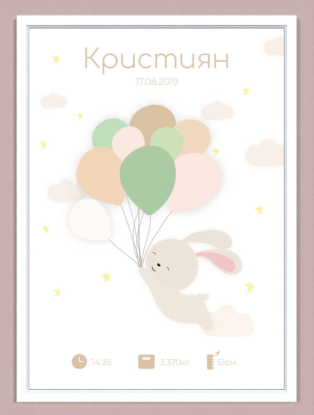 Персонализация с име, дата, час, ръст и тегло на бебето