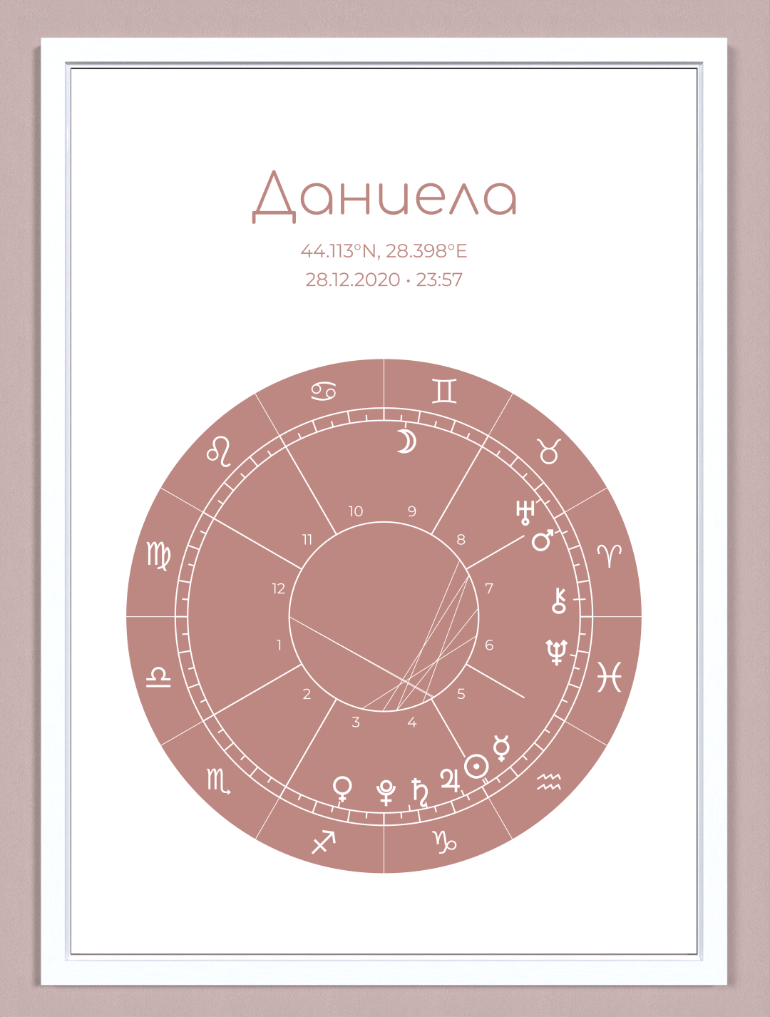 Продуктът представлява стилен дизайн на наталната карта, поставен в рамка, във избран от Вас размер. Рамката е дървена със антирефлексно стъкло и въженце за окачване. Всяка натална карта върви и с кратък наръчник за тълкуване на позициите на планетите и аспектите между тях.