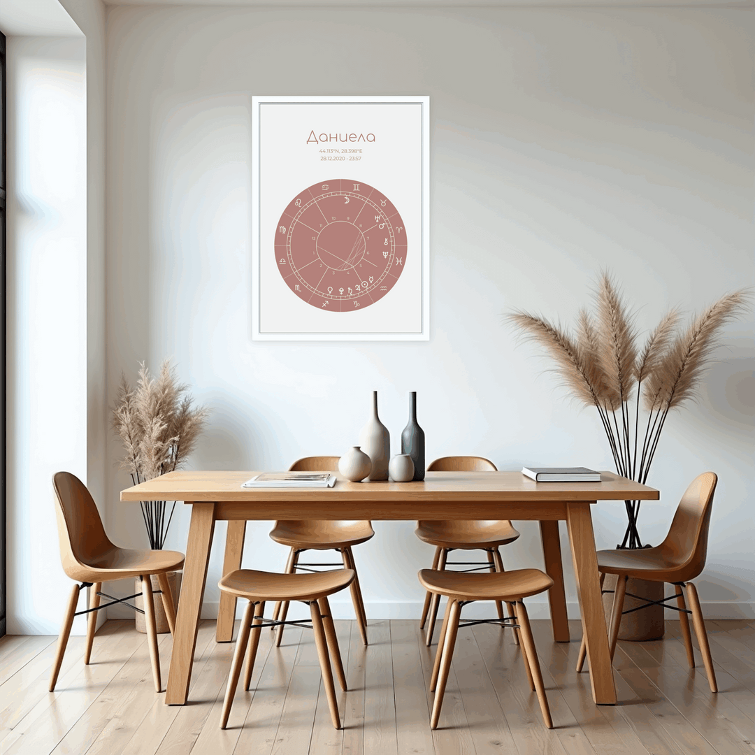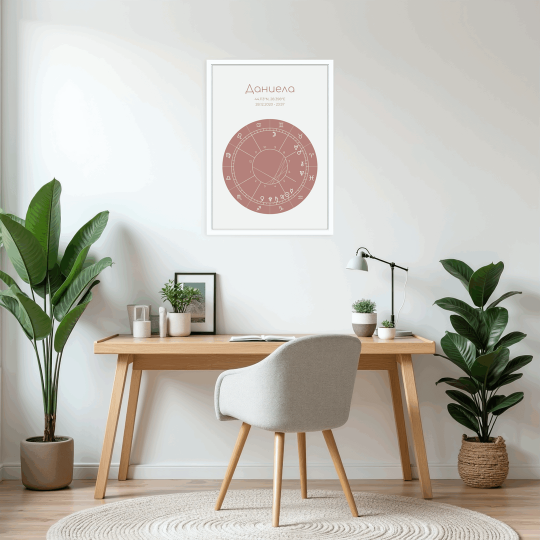 Продуктът представлява стилен дизайн на наталната карта, поставен в рамка, във избран от Вас размер. Рамката е дървена със антирефлексно стъкло и въженце за окачване. Всяка натална карта върви и с кратък наръчник за тълкуване на позициите на планетите и аспектите между тях.