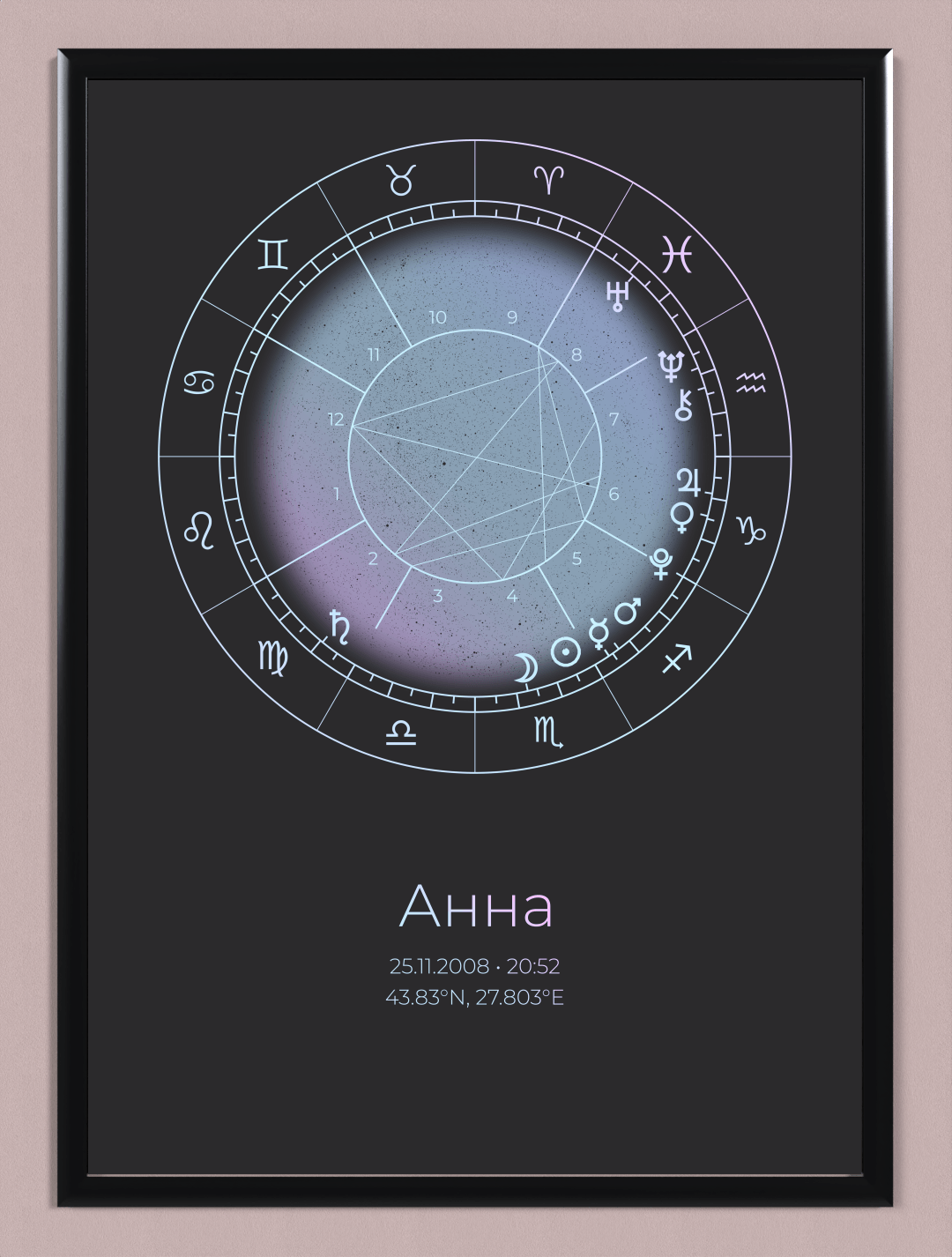 Продуктът представлява стилен дизайн на наталната карта, поставен в рамка, във избран от Вас размер. Рамката е дървена със антирефлексно стъкло и въженце за окачване. Всяка натална карта върви и с кратък наръчник за тълкуване на позициите на планетите и аспектите между тях.