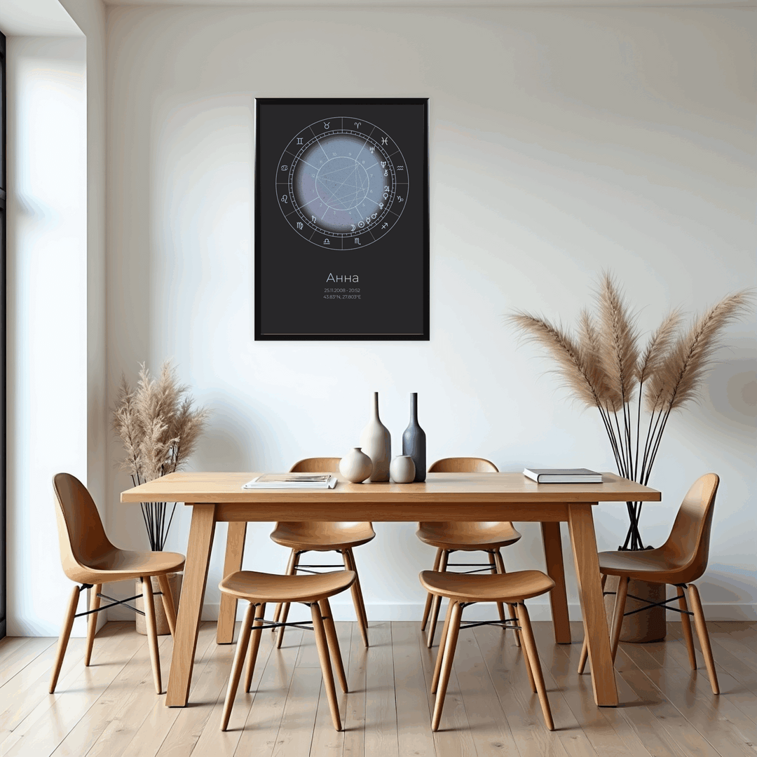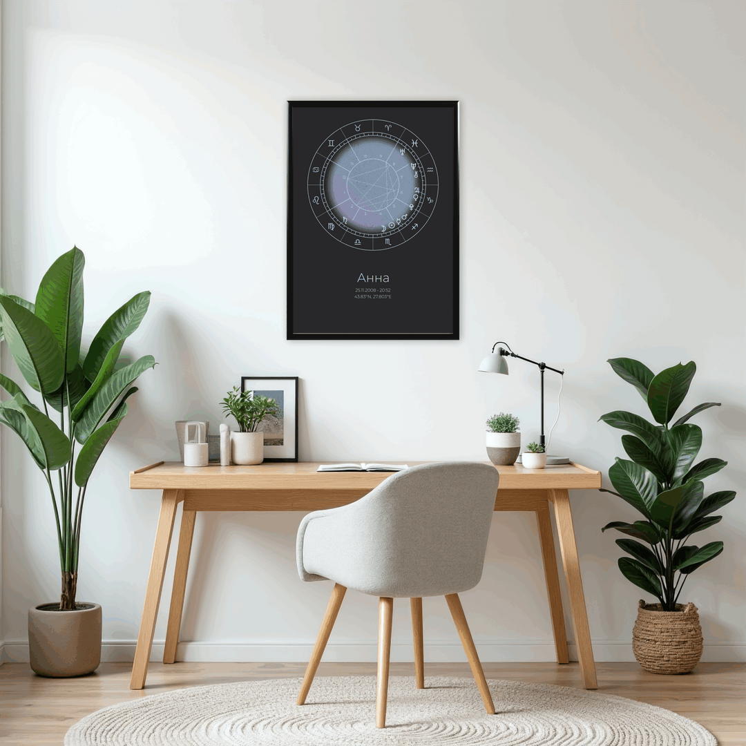Продуктът представлява стилен дизайн на наталната карта, поставен в рамка, във избран от Вас размер. Рамката е дървена със антирефлексно стъкло и въженце за окачване. Всяка натална карта върви и с кратък наръчник за тълкуване на позициите на планетите и аспектите между тях.
