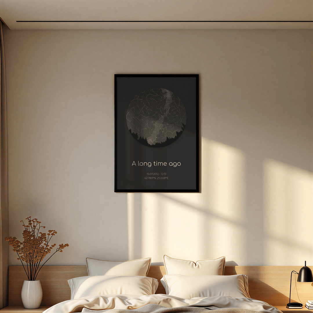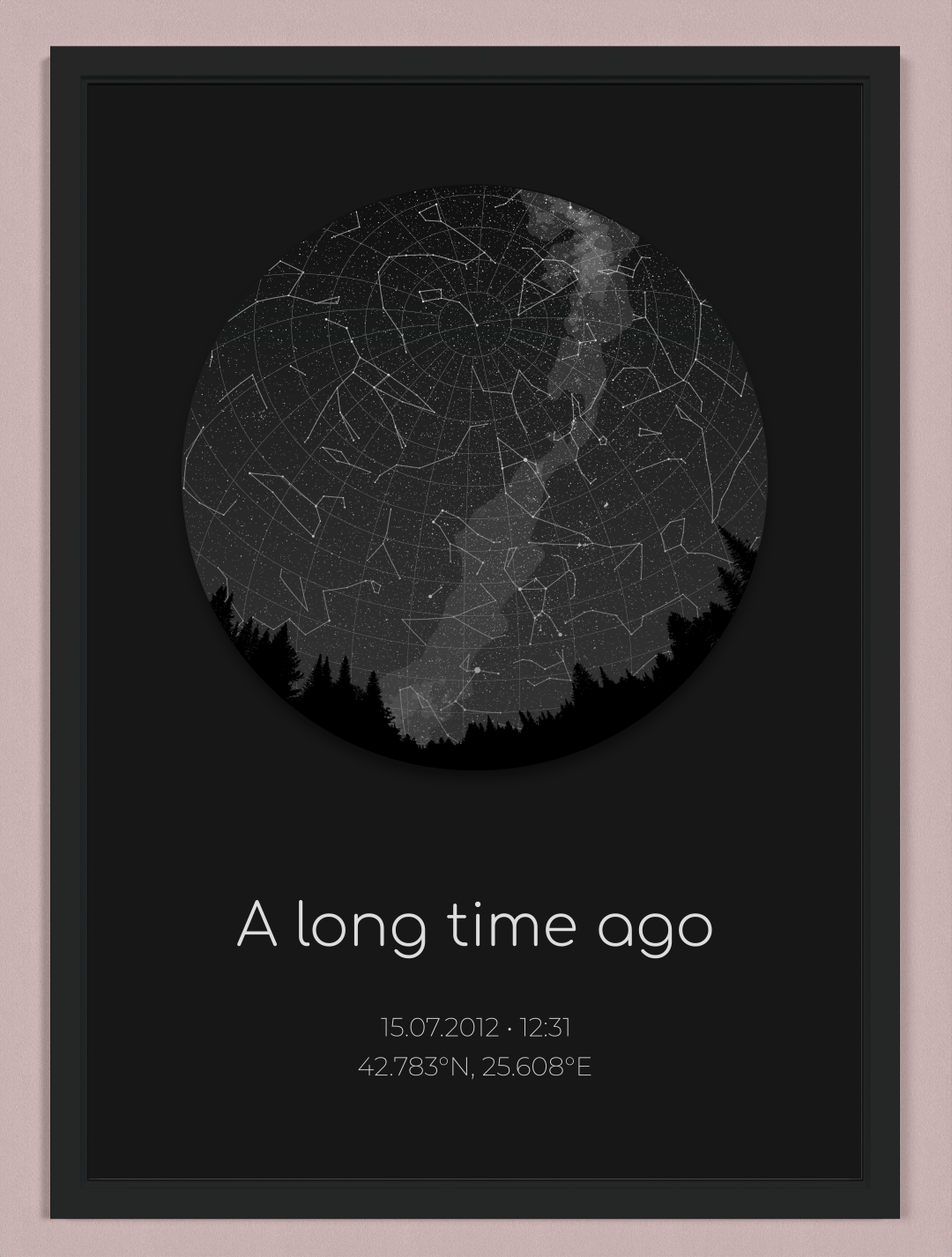 Звездната карта показва как е изглеждало небето в избрания от вас специален момент - първата среща, рожден ден, годишнина, сватба или друг важен повод.