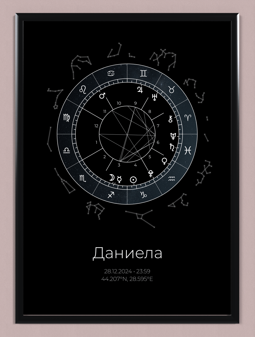 Продуктът представлява стилен дизайн на наталната карта, поставен в рамка, във избран от Вас размер. Рамката е дървена със антирефлексно стъкло и въженце за окачване. Всяка натална карта върви и с кратък наръчник за тълкуване на позициите на планетите и аспектите между тях.