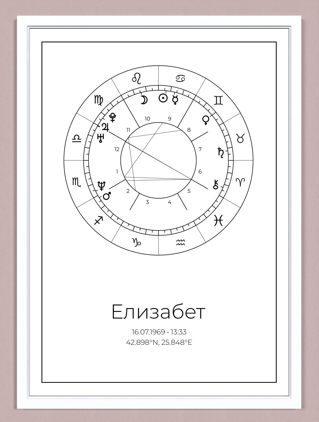 Продуктът представлява стилен дизайн на наталната карта, поставен в рамка, във избран от Вас размер. Рамката е дървена със антирефлексно стъкло и въженце за окачване. Всяка натална карта върви и с кратък наръчник за тълкуване на позициите на планетите и аспектите между тях.
