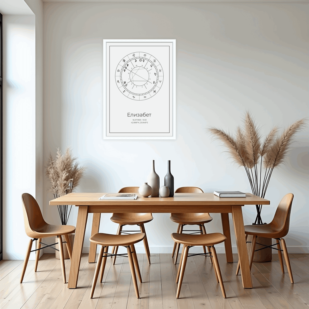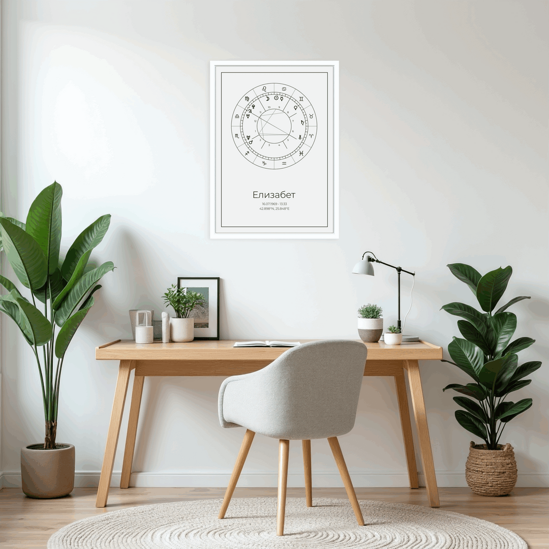 Продуктът представлява стилен дизайн на наталната карта, поставен в рамка, във избран от Вас размер. Рамката е дървена със антирефлексно стъкло и въженце за окачване. Всяка натална карта върви и с кратък наръчник за тълкуване на позициите на планетите и аспектите между тях.