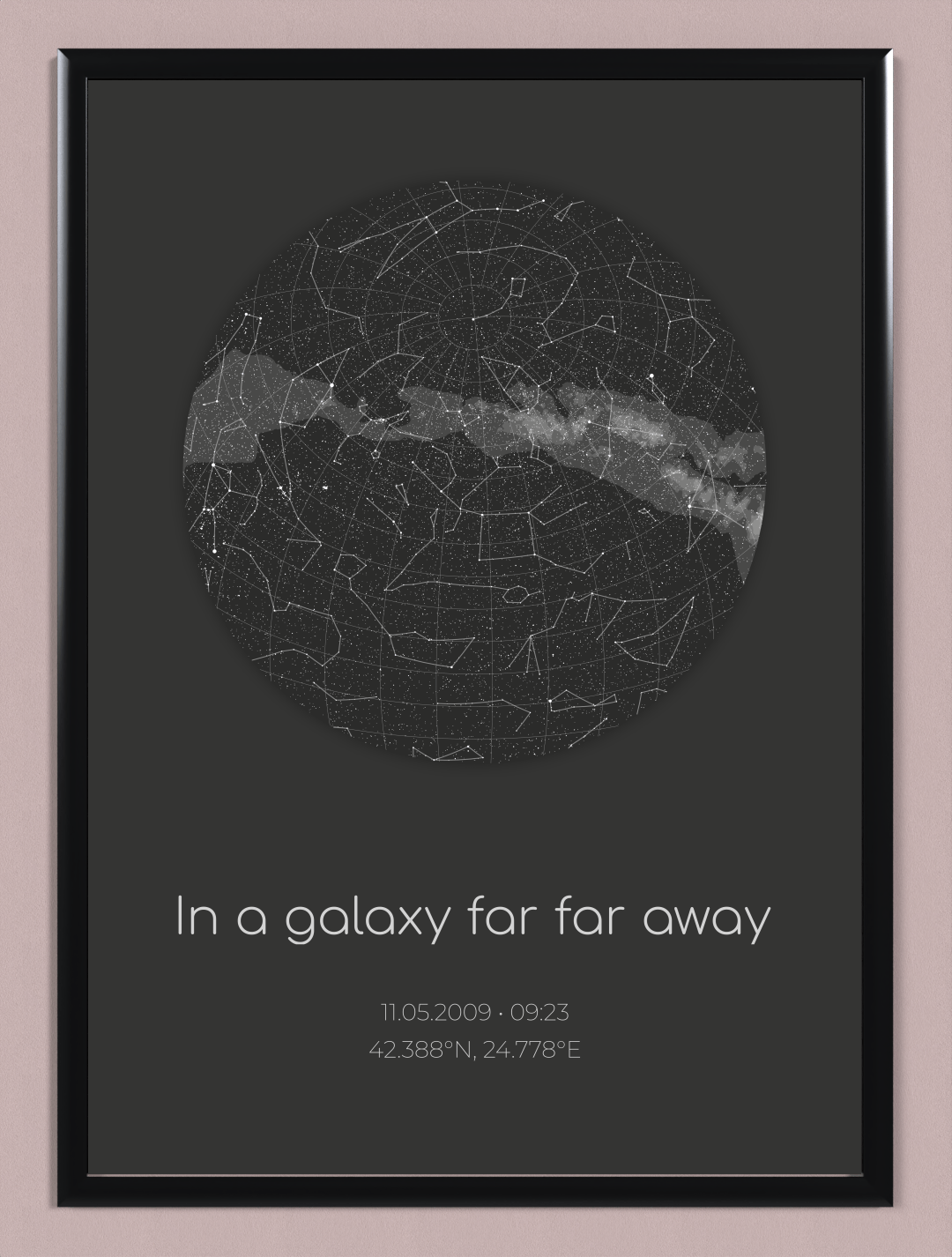 Звездната карта изобразява звездното небе в моментa на специално събитие. Това може да бъде първата ви среща, годишнина, рожден ден, сватба и всеки друг важен момент в живота ви!