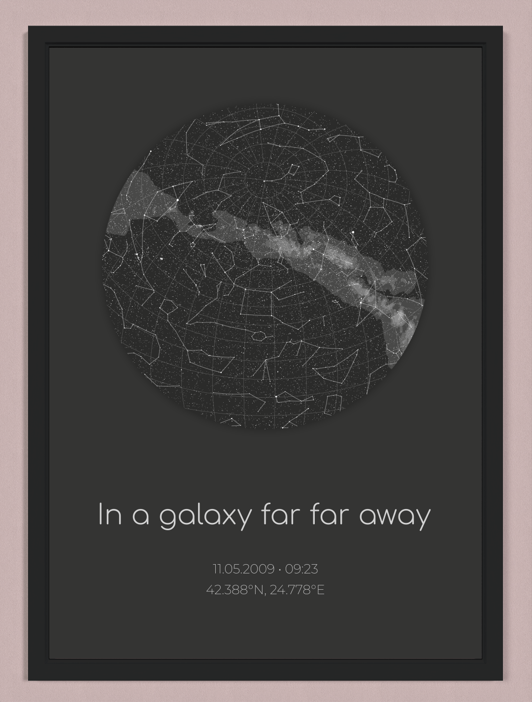 Звездната карта показва как е изглеждало небето в избрания от вас специален момент - първата среща, рожден ден, годишнина, сватба или друг важен повод.