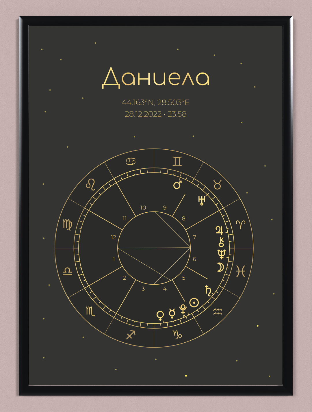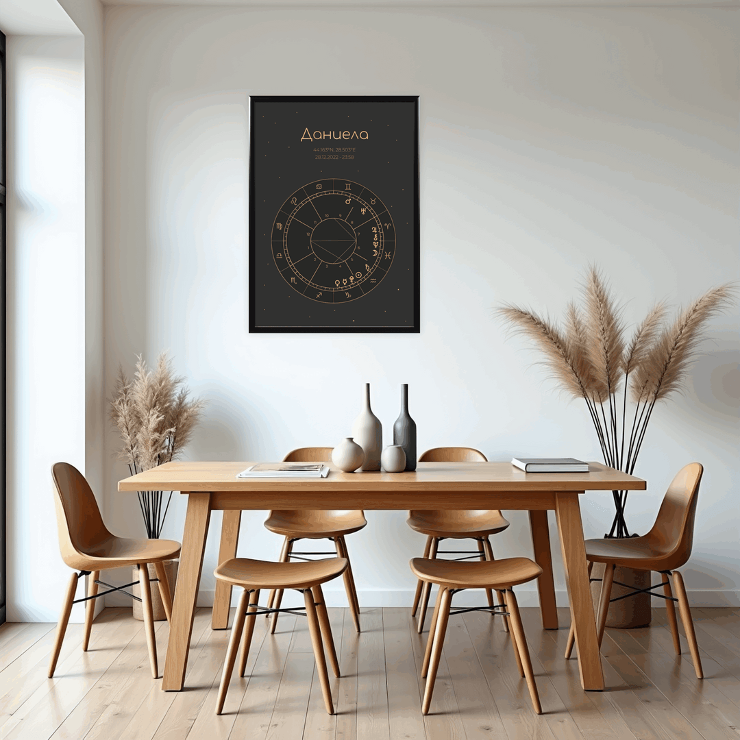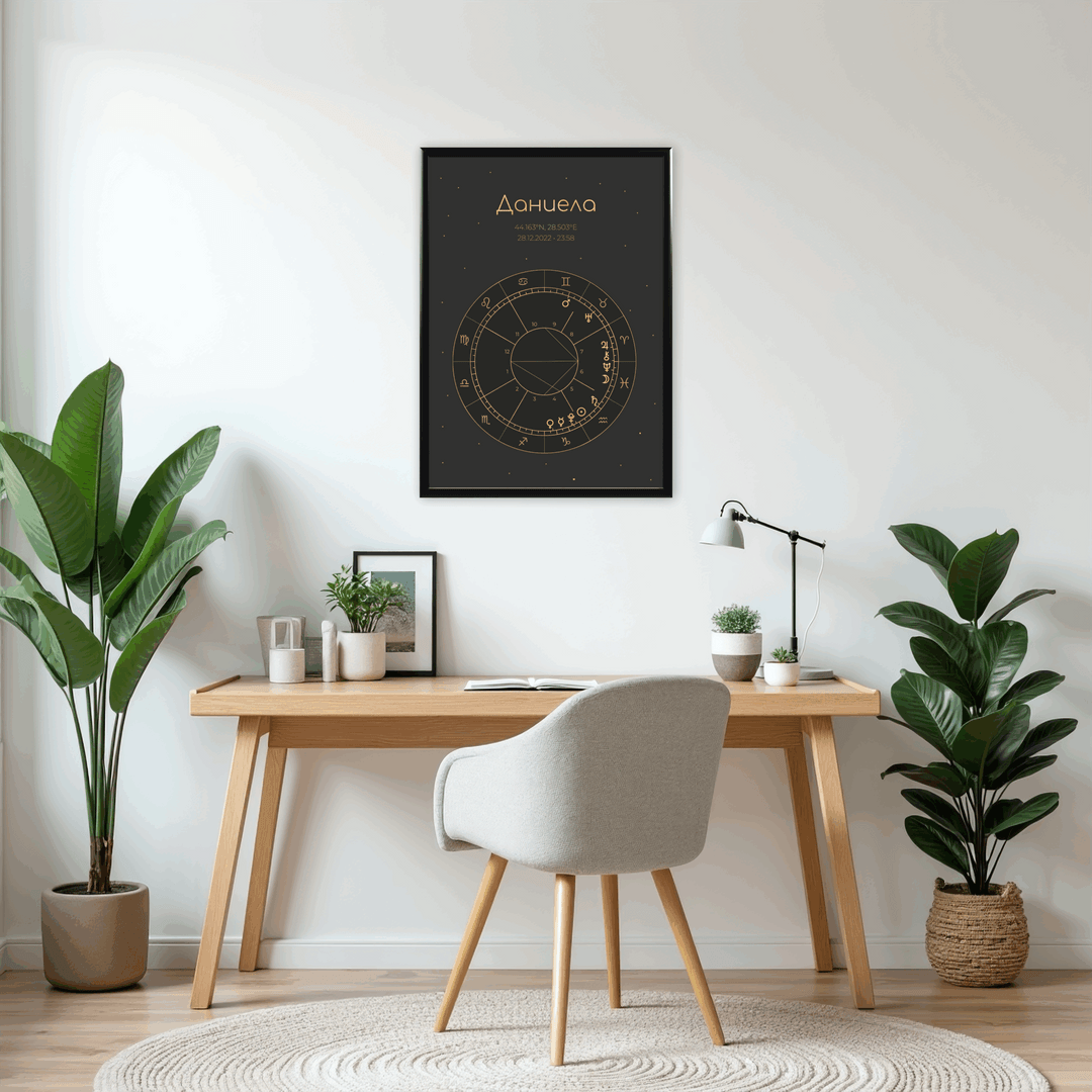Продуктът представлява стилен дизайн на наталната карта, поставен в рамка, във избран от Вас размер. Рамката е дървена със антирефлексно стъкло и въженце за окачване. Всяка натална карта върви и с кратък наръчник за тълкуване на позициите на планетите и аспектите между тях.